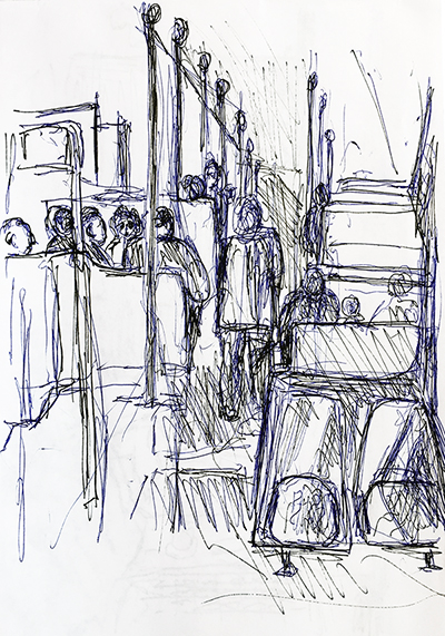 Nach der gestrigen sportlichen Ertüchtigung im Stadtwald dachte ich mir, ein Blick auf kulturell sich Ertüchtigende wäre eine passende Ergänzung. Also machte ich mich auf den Weg zum Archäologischen Nationalmusum. Um dorthin zu gelangen, musste ich den „Elektriko“ (die alte U-Bahn) nehmen – Gelegenheit für eine erste kleine Skizze, bis der Waggon sich füllte.