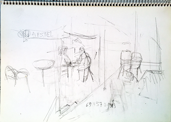danke, Beke! das ist das Schöne am Bloggen: was man sonst nur in seinem stilllen Kämmerlein bemerkt und bedenkt, kann man hier in die offene Diskussion stellen und durch die Reaktionen von Lesern erfahren, ob was dran ist. Und den Gedanken erweitern und fließen lassen – wie eben gerade jetzt durch dich, durch Ule, durch Ulli und Gerhard – das ist schön. Ja, auch ich mag die „gestresste“ Zeichnung, die ich eigentlich ausradieren wollte. Dann sah ich sie noch mal an und sagte mir: Hoppla! Die hat Qualitäten, die die entspannten Zeichnungen nicht haben. Es ist diese energische, in den Linien sichtbar werdende Suche nach Anhaltspunkten, um Beziehungen zwischen Raum, Dingen und Menschen zu markieren, die mir gefällt.