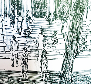 Unschlüssig, ziellos hin- und hergehende, sitzende, auf ein bestimmtes Ereignis wartende Menschen (die Tür des Museums soll sich öffnen). Ich selbst schaue entspannt und gleichgültig von Ferne auf die Fremden. Nichts drängt mich. Nichts verbindet uns.