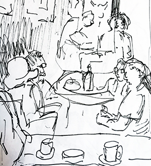 Heute setzte ich mich in ein Cafe, um auf meinen Mann zu warten und dabei eine Zeichnung für meine Serie „Menschen in ihrer Umwelt“ zu machen. Das Cafe war klein und nett, erstreckte sich über drei Stufen, ich suchte mir einen Platz im Hintergrund, von wo ich einen guten Überblick hatte, ohne bemerkt zu werden – und begann zu zeichnen. Skizzierte mit Bleistift die vielen Senkrechten und Waagrechten des Raums und der Stühle, die Rundungen der Tische und Sonnenschirme, zeichnete Menschen, die sich setzten oder aufstanden, sogar einen Hund skizzierte ich. Leider scheiterte ich. Nichts funktionierte, wie ich es wollte. Ich war entnervt und radierte aus, was ich begonnen hatte, setzte neu an, verzichtete schließlich aufs Zeichnen und besah mir lieber die Leute, die reifen Musmullla (gelbe Früchte) an dem Baum, den Schmetterling….
