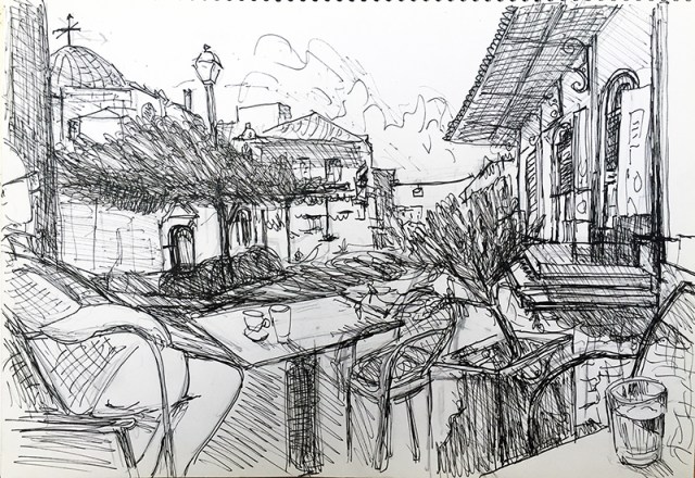 Als ich heute meinen Espresso in einem der Straßen-Cafes trank, skizzierte ich den Ausschnitt des Platzes vor mir: rechts der Eingang zum Museum, links die Kuppel und den Eingang der Kirche, ein Stück von dem hohen Kirchturm und ein bisschen von einem Touristen. Ich möchte die Skizze der Serie „Mensch und seine Umwelt“ zuordnen.