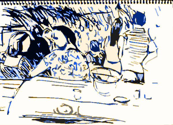 Jahresabschlussfeier in Lysos Garten (zwei Skizzen, Serie „Mensch und Umwelt“)