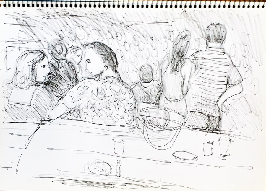 Jahresabschlussfeier in Lysos Garten (zwei Skizzen, Serie „Mensch und Umwelt“)