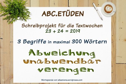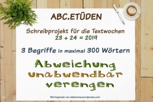 Der letzte Tag für diese Etüdewoche mit den Wörtern, die Werner Karstens spendete: Abweichung, unabwendbar verengen. Nichts gegen die Wörter, lieber Werner! Aber wer liebt schon das Unabwendbare? Und das Verengen, das Atemnot erzeugt? Ist eine Abweichung nützlich, um die Freiheit zu gewinnen? Oder eher verderblich?
