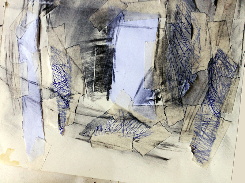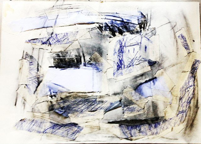 I won’t try to translate this time – I love the second collage. The way the blue rectangle in the center looks like a window, and jumps forward, the way the tape and the drawing show your hand at work. Fantastic!