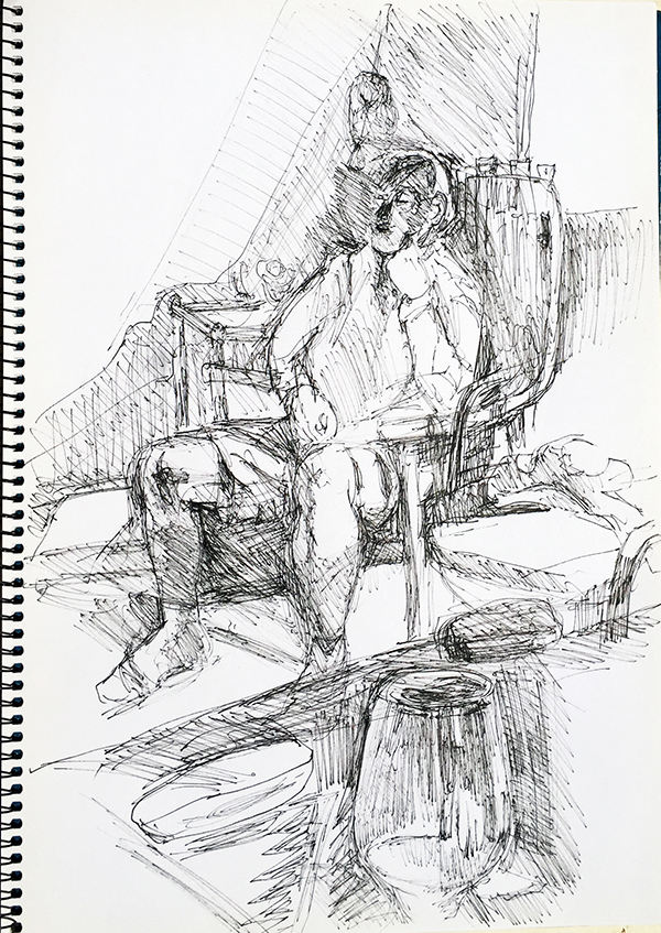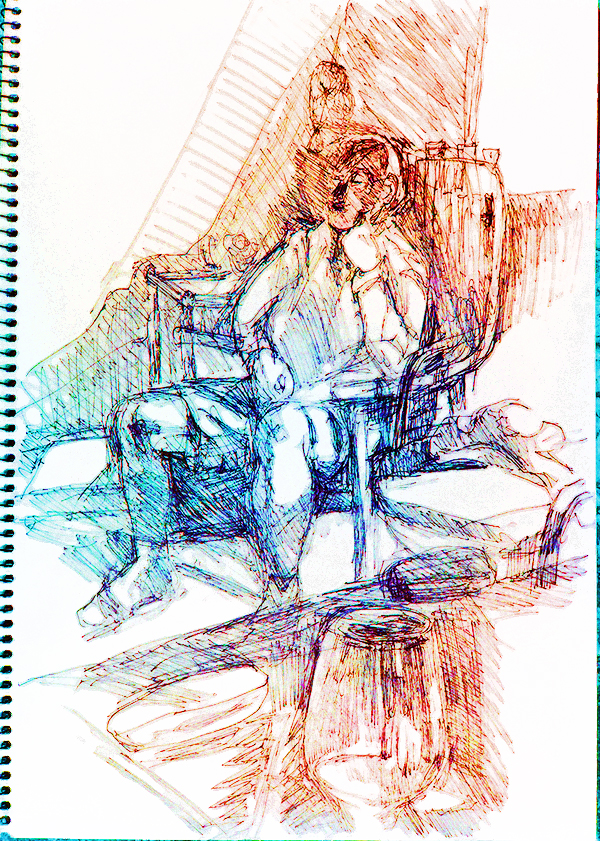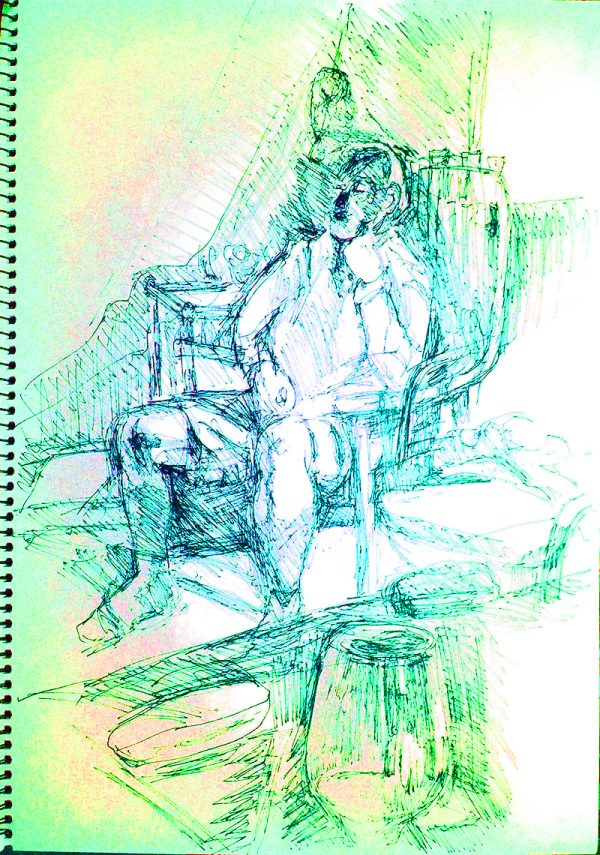 Unsicher das Licht, flackernd. Das Gesicht dunkel, die Gesichtszüge kaum zu erkennen. Nur das weiße Haar, der weiße Bart heben den Kopf von der Umgebung ab. Ich versuche dennoch, während ich mir mit Kopfhörern Vorträge aus dem Internet anhöre und so das Getöse des TV-Films ausblende und mich politisch bilde (Daniele Ganser über die Vertrauenswürdigkeit der Leitmedien, bei Ken.FM über die Feierlichkeiten des V-Tags und dass Russland fehlte, die deutsche Kanzlerin sich aber aufführte, als habe sie etwas Wesentliches zum Sieg über den Faschismus beigetragen…) eine Skizze des Mannes, der fast bewegungslos den bewegten Bildern auf der Mattscheibe folgt. Er sieht einen italienischen Krimi – er lernt Italienisch.