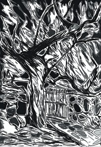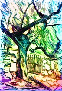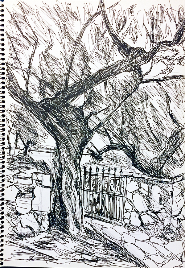 Im letzten Licht des Tages setzte ich mich an den Gartentisch und zeichnete den Olivenbaum, der beim Pförtchen in der Lücke der Ummauerung steht. Über die Mauer schauen weitere Bäume, auch ein Stück Meer leuchtet zu uns herüber. Das beet mit den Schwertlilien ist verschwunden, nur ein paar trockene Blätter erinnern noch daran.