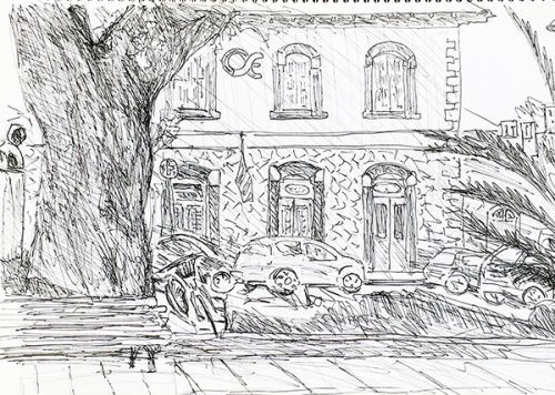 Das alte Stationsgebäude von Kalamata (Fineliner-Skizze)