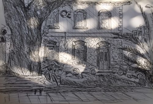 ← Das alte Stationsgebäude von Kalamata (Fineliner-Skizze)