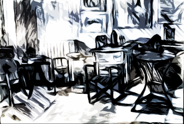 Ecke des Ateliers (Zeichnung, Licht-Schatten-Fotos, Bearbeitungen)
