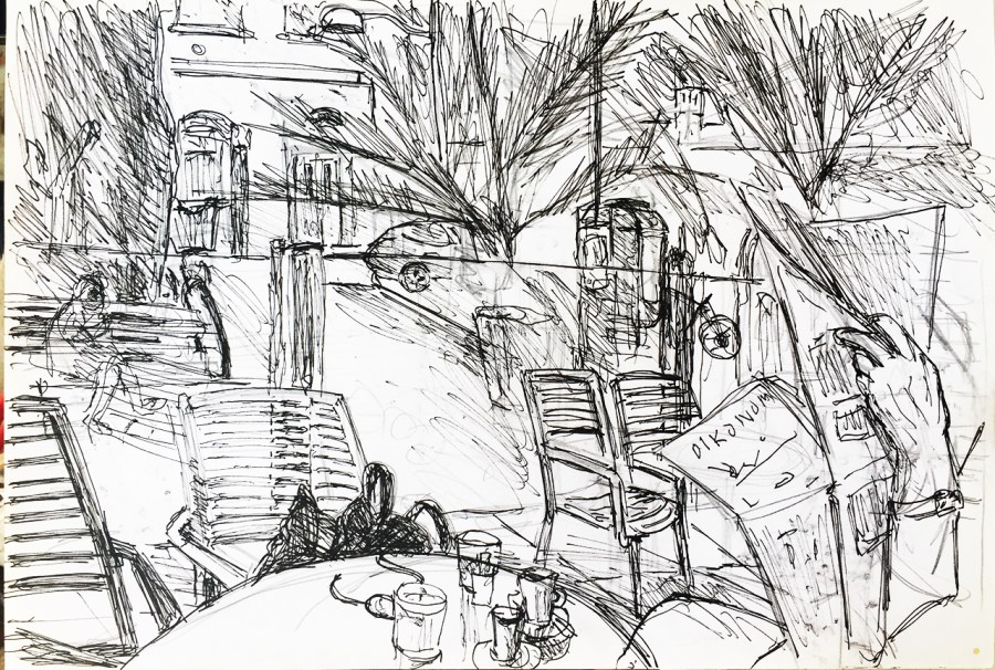 Cafe am Stationsgebäude (Zeichnung, Licht-Schatten-Fotos, Bearbeitungen). Serie Mensch und Umwelt