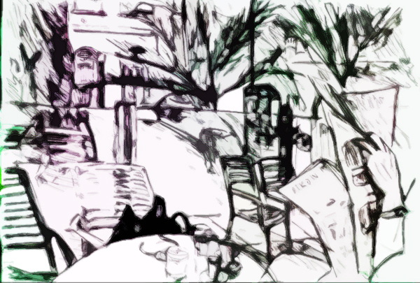 Cafe am Stationsgebäude (Zeichnung, Licht-Schatten-Fotos, Bearbeitungen). Serie Mensch und Umwelt