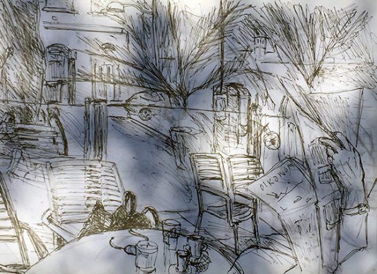Cafe am Stationsgebäude (Zeichnung, Licht-Schatten-Fotos, Bearbeitungen). Serie Mensch und Umwelt