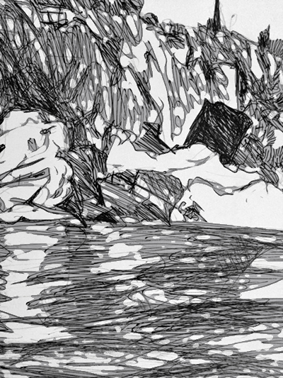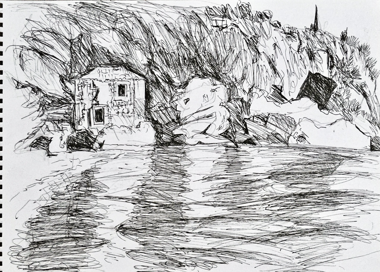 Jeden Abend gehe ich in „meiner“ Bucht schwimmen. Seit vielen Jahren tue ich das, sobald der Sommer kommt. Immer sehe ich auch das verfallende Haus auf den Felsen. Fotografiert habe ich es schon oft, auch Ulli Gau hat ihm einen Beitrag gewidmet. Heute zeichnete ich es zum ersten Mal.