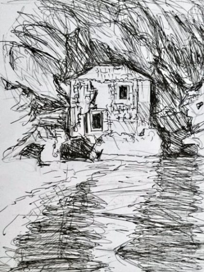 „Verlassenes Haus und Felsen am Meer“ Zeichnung