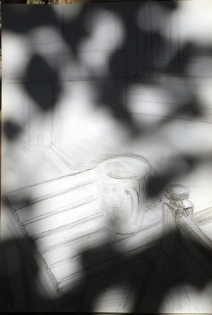 Wenn das Licht zu schnell für die Zeichnerin ist (Skizze mit Kaffeebecher und Hocker)