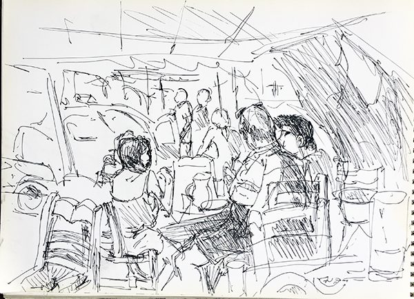 Thiasos (zu deutsch Schauspieltruppe, Kompanie oder Kumpanei) ist ein beliebtes Lokal im Stadtzentrum von Kalamata. Heute schnappte ich mir den äußersten Tisch, um unbeobachtet zu skizzieren. Zwei Szenen konnte ich mit dem Kuli festhalten. Zum Vergrößern bitte anklicken.