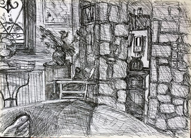 • Danke, Babsi. Bei uns hat es auch ungefähr diese Temperaturen. Deshalb blieb ich tagsüber meistens drinnen. Da ist es ziemlich dunkel, genau wie auf dem Bild, und man erkennt die Dinge nur schemenhaft. Die Schraffuren sollten diesen Eindruck vermitteln.