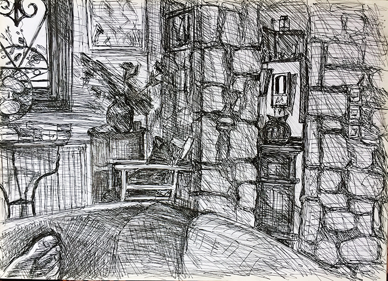 Das Haus ist im Stil der Türme der Mani gebaut, das bedeutet: 50 cm dicke Steinwände und – aus statischen, aber auch aus klimatischen Gründen – schmale Öffnungen. Der große Raum hat insgesamt sieben schmale hohe Fenster, eine Fenstertür und den (gewölbten) Durchgang, den ich heute zeichnete.