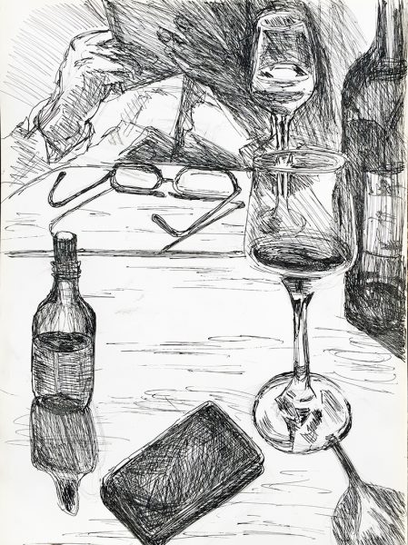 ← Nachts, bei Kunstlicht von oben. („Mit Flaschen, Gläsern etc“, Zeichnung, Serie „Mensch und Umwelt“)