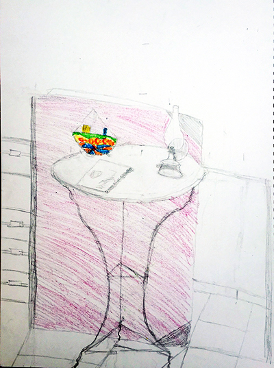 Heute nachmittag kamen Poppy und Yola zum gemeinsamen Zeichnen. Sie wollten erneut instruiert werden, wie man perspektivisch „richtig“ zeichnet. Yola machte sich dann mit viel Eifer daran, den Tisch mit ein paar darauf arrangierten Dingen zu zeichnen, während Poppy nach einem Versuch, erst Yiola und dann den Tisch „korrekt“ zu zeichnen, zu ihren routinierten Ikonen-Köpfen zurückkehrte. Ich selbst zeichnete die beiden Zeichnerinnen im Atelier.