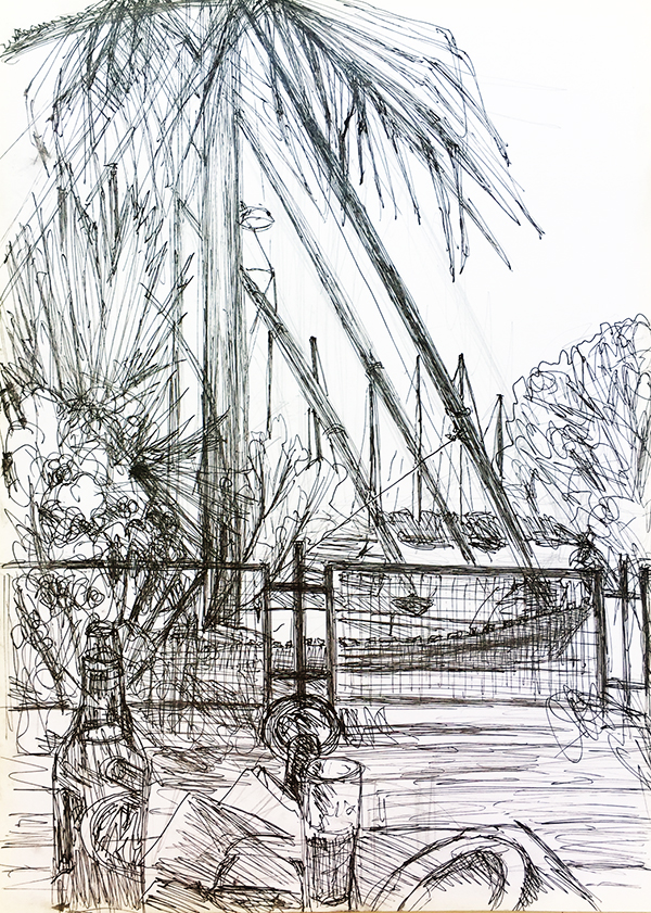 Liebe Gerda, ich hatte auch das Gefühl, es fehlt etwas und sah mir dann Deine beiden größeren Zeichnungen an, auf denen der Hafen hinter einem Zaun ein wenig versteckt liegt und im Vordergrund nun der Zaun mit dem Kreuz, gleich zweimal und im vordersten Bereich, noch ein Stück vom Zaun entfernt, ein Tisch, der kaputt zu sein scheint und eine Flasche plus Glas und ovale Platte.