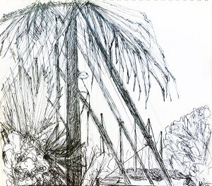 Liebe Ule, ich muss dir was gestehen, was du ja schon selbst gesehen hast: Die beiden Bilder sind nicht identisch. Das zweite (komplette) ist die erste Fassung, die ich vor Ort gemacht und fotografiert habe. Ich habe die Zeichnung dann zu Hause noch mal nachgearbeitet, insbesondere (aber nicht nur) die Schraffur des Mastes (nicht „Baumstammes“) verstärkt und die Zeichnung dann erneut fotografiert.