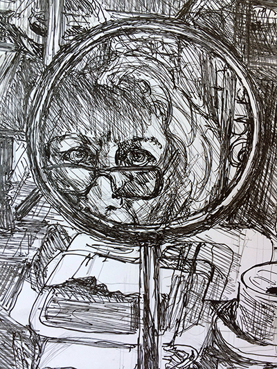 Im Spiegel und außerhalb des Spiegels (Serie „Mensch und Umwelt“, Zeichnung)