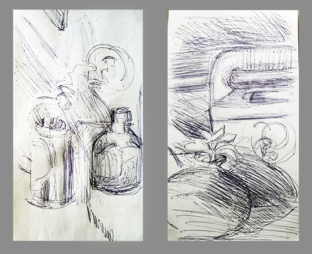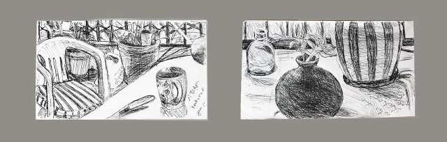 Auf der vierten Zeichnung siehst du ganz vorn eine runde dunkle Tonvase, dahinter links ein gläsernes Väschen. Beide gibt es auch auf den nächtlichen Zeichnungen. Oben im Querformat,  und in der Nacht davor im Hochformat. Wie anders ist die Wahrnehmung!