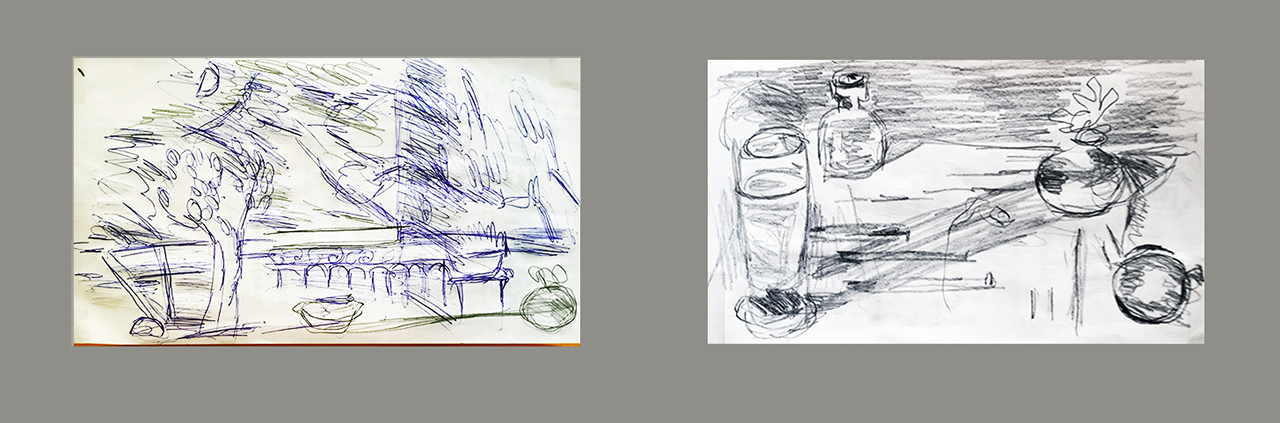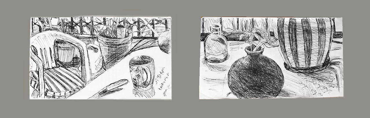 Am Morgen setzte ich mich auf den nun schattigen Balkon und machte zwei weitere Skizzen, um die Wahrnehmung von Dingen und Licht zu vergleichen. Dafür benutzte ich einen schwarzen Kuli. (Draufklicken = Vergrößern)