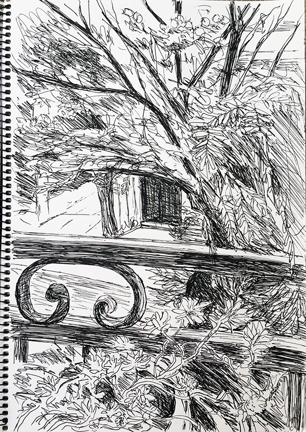 Am späten Nachmittag bezog sich der Himmel, es könnte ein Gewitter geben. Großes Aufatmen! Ich setzte mich auf den Straßenbalkon und zeichnete. Das Gewitter ging dann zwar woanders nieder, aber die Atmosphäre hat sich inzwischen wohltuend abgekühlt. Ich denke, man sieht es den Zeichnungen an, dass es nun keine 40 Grad mehr sind…