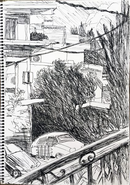 Neue Straßenblicke vom Balkon (zwei Zeichnungen)