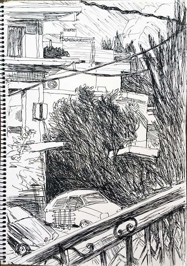 Seither habe ich viele verschiedene Stilarten, Medien und Motive durchprobiert, immer vor der Natur zeichnend, zuletzt verstärkt zurückgehend ins Architektonische. Hier noch mal meine letzte Zeichnung zum Vergleich.