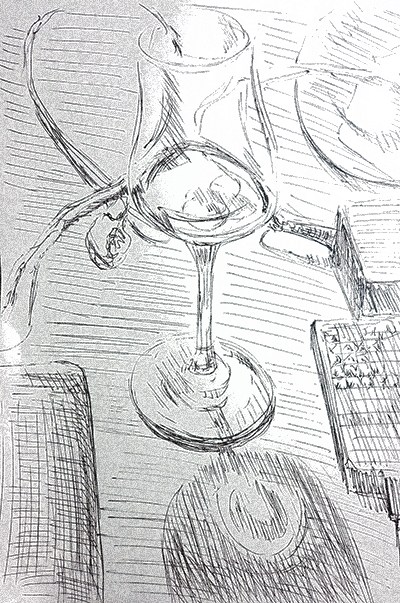 Heute Nacht machte ich noch eine Zeichung auf dünnem Skizzenpapier: Mein leeres Weinglas, umrundet und durchdrungen von Kabeln und Computer-Zubehör, auf der Glasplatte des Schreibtisches.