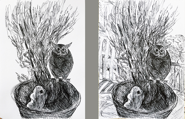 Stillleben mit Eule – Experimente ohne und mit Hintergrund (Zeichnung 2019-07-16)