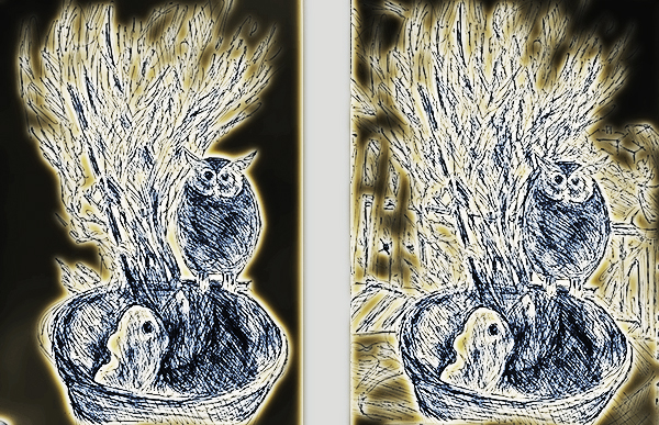 Stillleben mit Eule – Experimente ohne und mit Hintergrund (Zeichnung 2019-07-16)