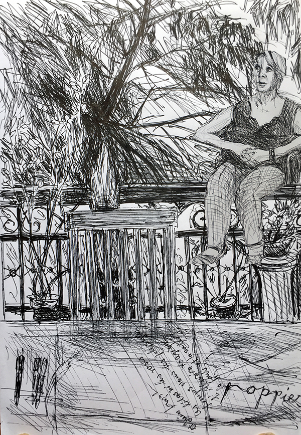 Oder wenn Poppy die Pinie hochklettern und auf dem Geländer Platz nehmen würde? Dann bekäme das Wort „poppies“ (Mohn) auf der Tischdecke eine völlig neue Bedeutung.