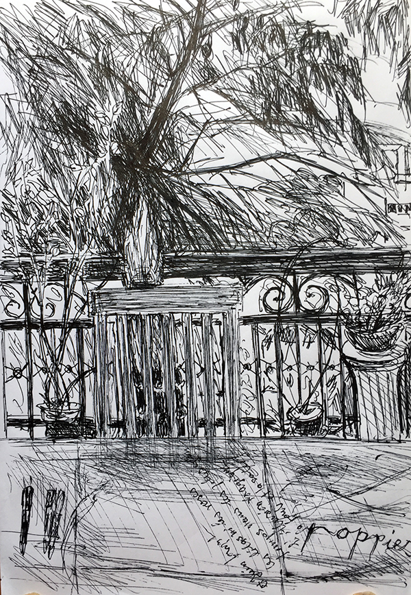 Nur … es fehlt nicht am „Sujet“, das Balkongitter, die zwei Stifte, die Schrift auf der Decke, der leere Stuhl … es fehlt vielleicht das Leben, zunächst ist es ein Stillleben, was sofort anders ist, wenn Menschen in diesem Raum Platz nehmen, das hast du wunderbar dargestellt und letztlich „gespiegelt“ – bliebe die Frage, wird Raum dann lebendig, wenn Wesen es bevölkern und sind Pflanzen nicht auch Wesen und …