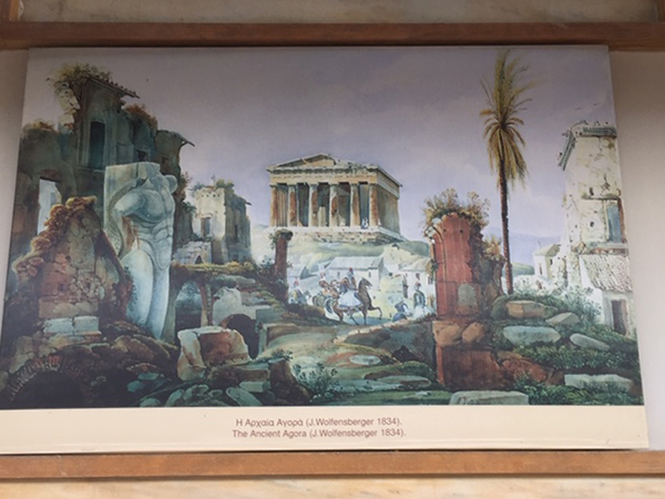 Dann ging jede ihres Wegs, Julia hinauf in den lichtvollen Abend, ich hinab in die Station des Thisseion. Ich besah mir die alten Fotos der Gegend, die dort als Stationsschmuck angebracht sind, fotografierte auch das Gemälde eines deutschen Reisenden aus dem 19. Jahrhundert.