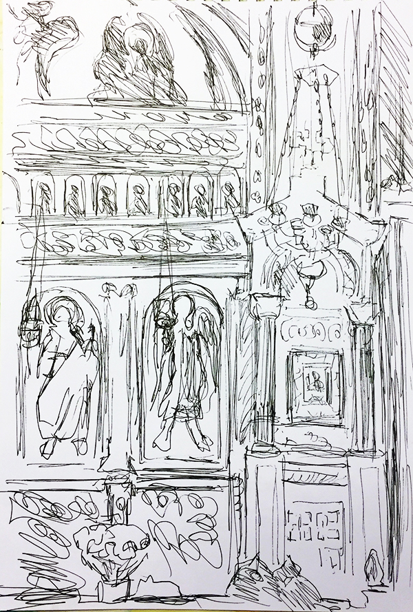 Die geöffnete Tür einer Kirche lockte mit Kühle und Stille. Ich übersah die beiden Bettelnden auf den Kirchenstufen – einen alten bärtigen und einen jüngeren mageren Mann, na ja, ich versuchte es jedenfalls – und schlich mich in eine der vorderen Reihen der geschnitzten Holzbänke. Ein wenig zeichnen? Es war meine erste Skizze im Innern einer Kirche – ich denke, ich werde es öfter machen.