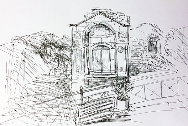 Beim Turm der Winde angelangt, fand ich tatsächlich eine Schattenbank. Kaum hatte ich das gegenüberliegende Gemäuer zu skizzieren begonnen, erschien Julia, hochgewachsen und jung, mit lächelnden braunen Augen mich begrüßend. Während ich weiter zeichnete, luden wir unsere Neuigkeiten ab, ich auch Reminiszenzen aus Zeiten, als Julia noch nicht geboren war. Ich fürchte, ich tue das allzu gern. Andererseits – die Gemäuer auf diesem Platz waren jedenfalls doch noch mal sehr viel älter als ich….