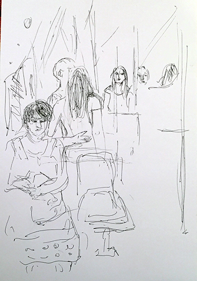 Ein Sitzplatz in der Bahn erlaubte mir, noch eine schnelle Skizze von Mitreisenden zu versuchen. Und so schloss sich der Kreis.