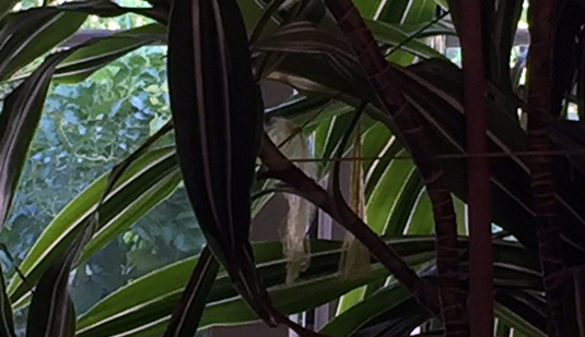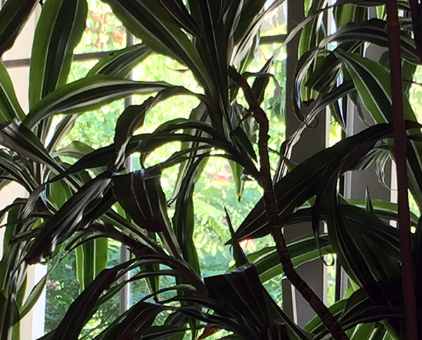 Keine Zeichnung heute, nur ein lässiges Foto vom Sofa aus. So verschieden die Grüns drinnen und draußen, so lebendig. Gerahmt von der leichten halb durchsichtigen Gardine.