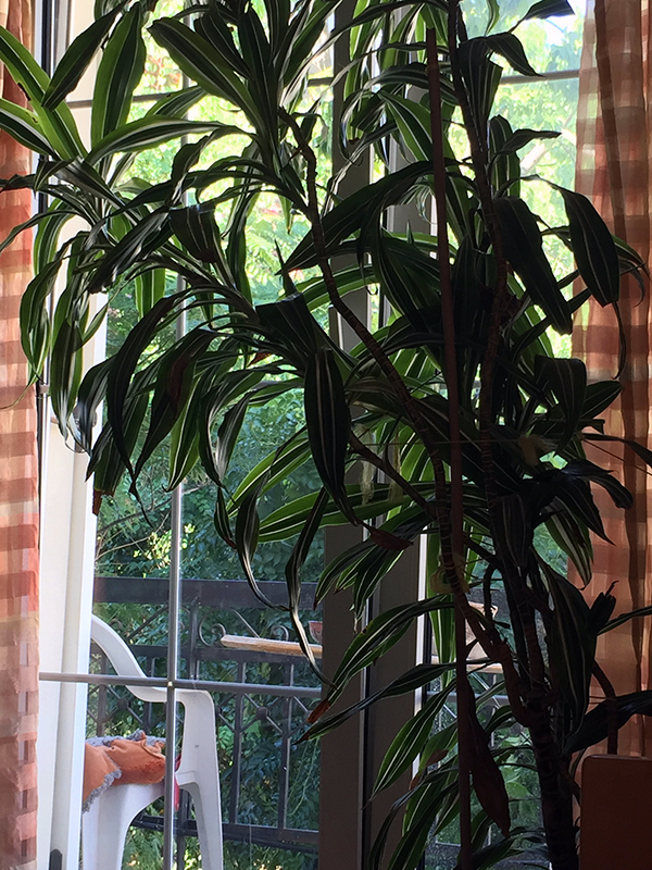 Keine Zeichnung heute, nur ein lässiges Foto vom Sofa aus. So verschieden die Grüns drinnen und draußen, so lebendig. Gerahmt von der leichten halb durchsichtigen Gardine.