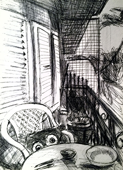 Bei schwindendem Licht (Zeichnung des leeren Balkons mit Eulenkissen, 2019-07-25)