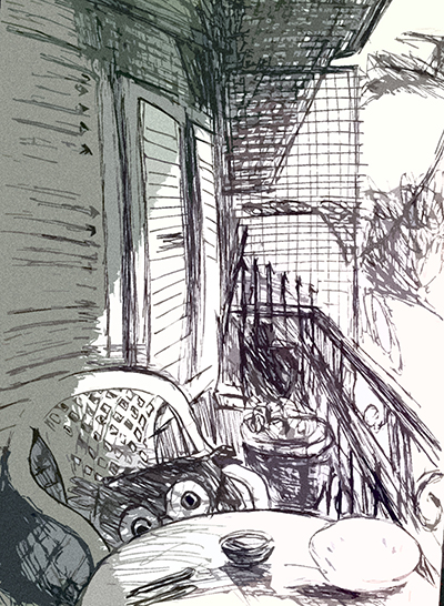 Bei schwindendem Licht (Zeichnung des leeren Balkons mit Eulenkissen, 2019-07-25)