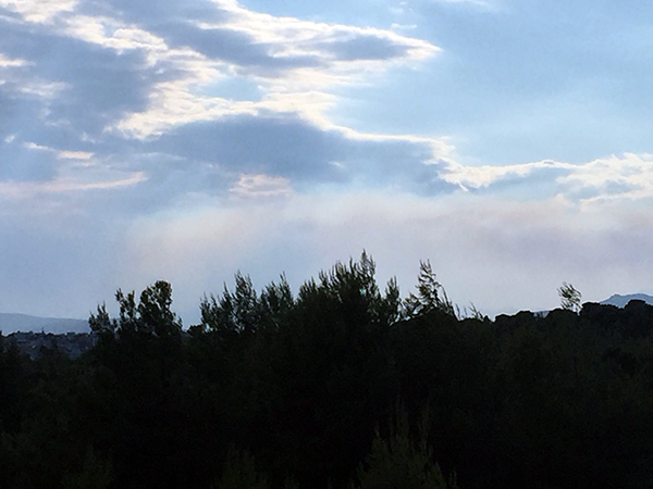Es brannte gestern in der Gegend von Elefsina (Eleusis) an mehreren Stellen zugleich. Doch das Feuer konnte weitgehend eingedämmt werden. Am Himmel hatten sich abenteuerliche Formen und Farben gesammelt – das rötliche Braun der Pinienwälder, wenn sie in Flammen aufgehen, mischte sich großräumig mit fluserigen Wolken, die auf- und abziehen, ohne Regen zu produzieren.