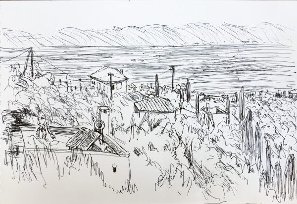 Heute setzte ich mich auf die Turmterrasse, um den Blick von oben übers Olivenland und Meer zu zeichnen. Im ersten Anlauf beschränkte ich mich auf das, was einem solchen Motiv frommt, und blendete aus, was normalerweise als störendes Beiwerk angesehen wird und was auch Fotografen möglichst nicht im Bild haben möchten. Immerhin blieb ich bei der Wirklichkeit, zeichnete nicht nur Zypressen, sondern auch Strommasten und im Vordergrund eine Terrasse mit Sonnenkollektoren sowie einen Handwerker, der die Terrasse weißt.