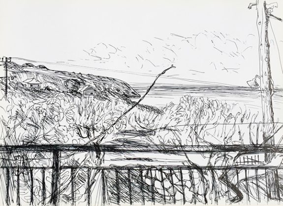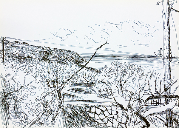 Wieder auf der Turmterrasse sitzend, diesmal nach Süden blickend, habe ich skizziert, was sich da zeigte. Die Entscheidung fiel mir etwas schwer, denn in der Richtung gibt es vor allem Bäume von oben gesehen, und jede Baumkrone hat unendlich viele Blätter, die ich natürlich nicht alle zeichnen kann. Ein Teil der Sicht wird zudem durch das Laub des Aprikosenbaums bestimmt, was noch mehr Blätter bedeutet. Und dann die Natursteinmauer….
