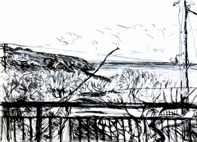 Die Skizze enthält also ein „gemischtes Programm“ von Natur und Technik, wobei „Natur“ überwiegt, zumal der dominante Lichtmast als Baumstamm zu erkennen ist. Weitere technische Elemente wie das begrenzende Balkongitter und einen Draht, der als Wäscheleine dient, habe ich zunächst ausgeblendet.